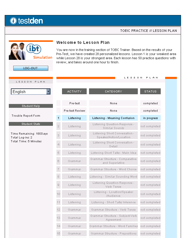 TestDEN's TOEIC Online Course is the oldest and most reputable online training program available on the Internet. To maximize your benefit, we recommend that you begin training at least 30 days before you take the real exam.