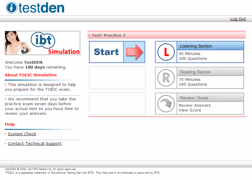 As soon as you receive your password, you are ready to start. TestDEN recommends that you begin at least 30 days before you plan to take the TOEIC test. This will give you enough time to do all the practice questions and go through the Test Review.