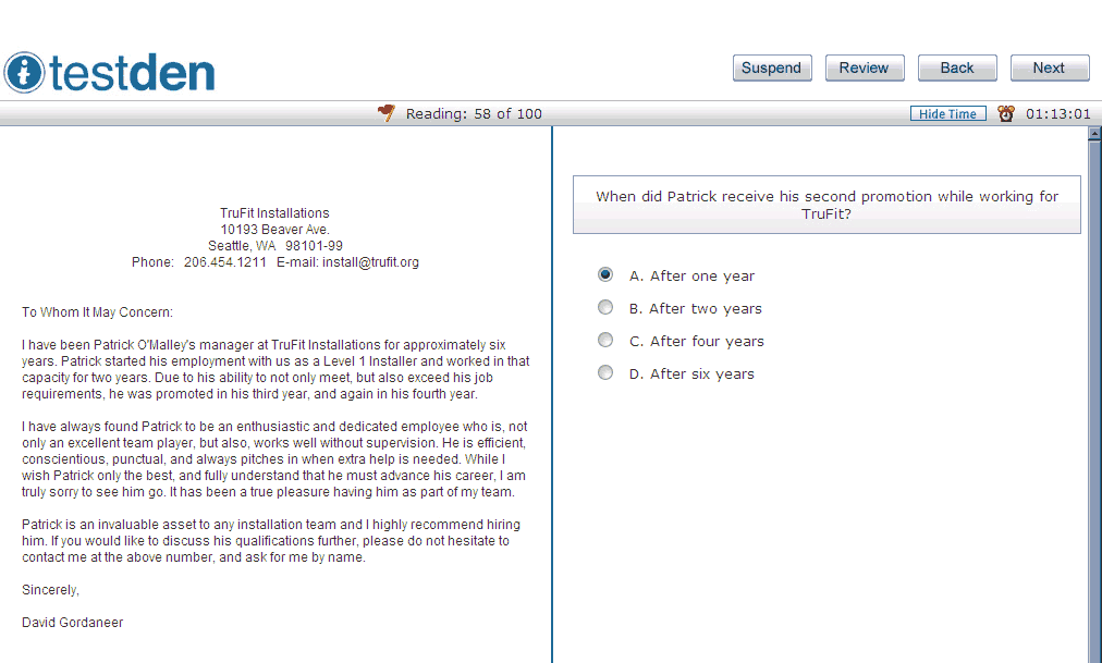 Timed reading section so you know exactly what to expect. You may suspend your test at any time, and continue where you left off the next time you log in.