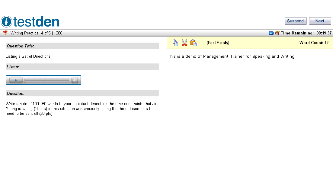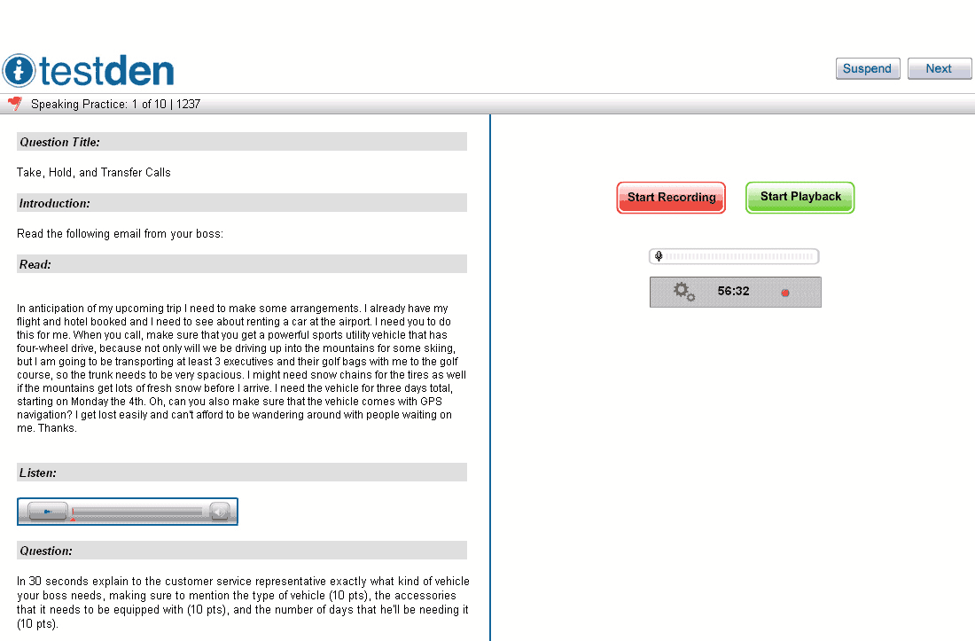 Using a headset and microphone, record yourself in the speaking section. Powerful TestDEN technology digitizes and saves your answers on our server.